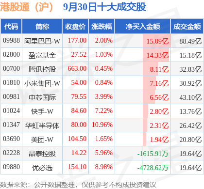 证券之星消息,9月30日,恒生指数涨0.87%,报收26855.56点。当日南向资金净买入154.803亿港元,交易所公布的港股通(沪)十大成交股中,净买入个股共8只,净买入金额最多的是阿里巴巴-W,净买入15.09亿港元,净卖出个股共2只,净卖出金额最多的是优必选,净卖出4728.62万港元。详情可见下表: