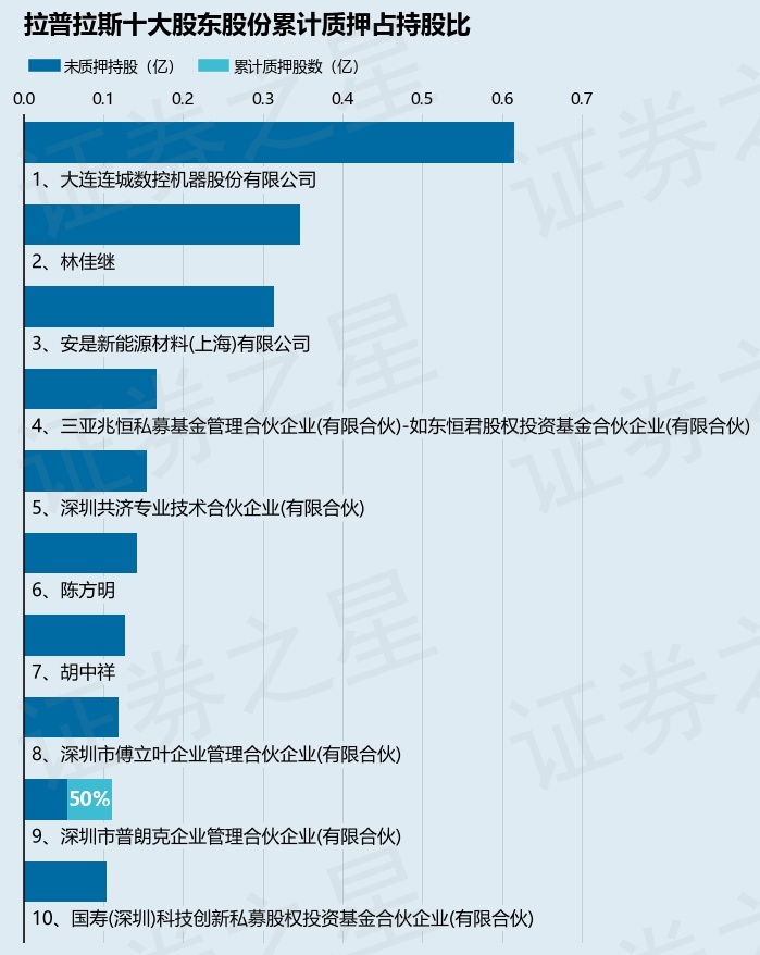 截止本公告日,股东深圳市普朗克企业管理合伙企业(有限合伙)已累计质押股份553.06万股,占其持股总数的50.0%。本次质押后拉普拉斯十大股东的累计质押股份占持股比例(占持股比例的计算以公司最新一期财务报表公布的十大股东的持股总数为基准)见下图: