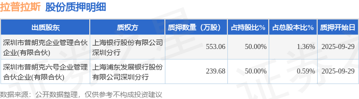 证券之星消息,拉普拉斯(688726)9月30日公开信息显示,股东深圳市普朗克企业管理合伙企业(有限合伙)、深圳市普朗克六号企业管理合伙企业(有限合伙)向上海银行股份有限公司深圳分行、上海浦东发展银行股份有限公司深圳分行合计质押792.74万股,占总股本1.95%。质押详情见下表: