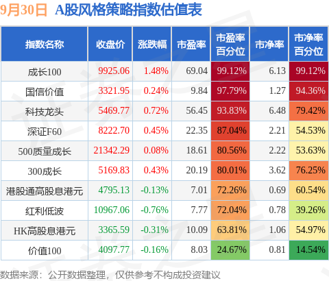 风格策略指数方面,成长100的市盈率百分位较高,为99.12%。而价值100的市盈率百分位较低,为24.67%。