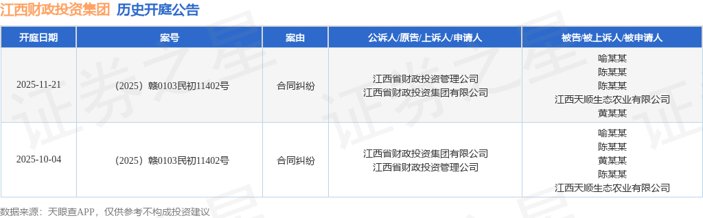 证券之星消息,根据天眼查APP显示,近日公布了一则江西省财政投资集团有限公司作为原告/上诉人的开庭公告,详细内容如下: