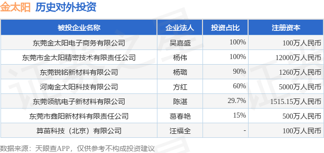 通过天眼查大数据分析,东莞金太阳研磨股份有限公司共对外投资了7家企业,参与招投标项目18次;财产线索方面有商标信息50条,专利信息122条;此外企业还拥有行政许可88个。据2024年报数据,金太阳商誉0.0万元。长期股权投资211.92万元,同比减45.68%。