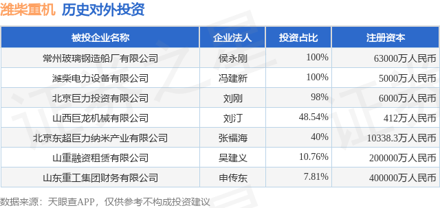 证券之星消息,根据天眼查APP显示,潍柴重机(000880.SZ)新增一起对外投资事件,被投资公司为常州玻璃钢造船厂有限公司,法定代表人侯永刚,投资占比为100%。该公司从事铁路、船舶、航空航天和其他运输设备制造业,注册资本为63000万人民币。目前,潍柴重机共存在对外投资7项,详见下表: