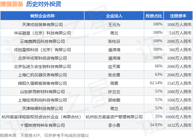 证券之星消息,根据天眼查APP显示,捷强装备(300875.SZ)新增一起对外投资事件,被投资公司为山东碳寻新材料有限公司,法定代表人许兰兰,投资占比为51%。该公司从事科技推广和应用服务业,注册资本为1000万人民币。目前,捷强装备共存在对外投资13项,详见下表:
