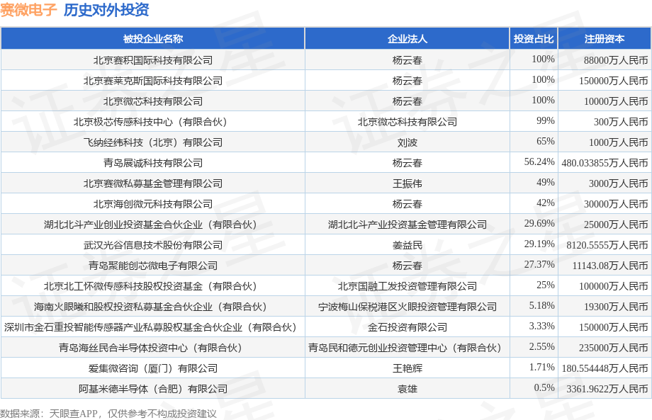 证券之星消息,根据天眼查APP显示,赛微电子(300456.SZ)新增一起对外投资事件,被投资公司为青岛展诚科技有限公司,法定代表人杨云春,投资占比为56.24%。该公司从事餐饮业,注册资本为480.033855万人民币。目前,赛微电子共存在对外投资17项,详见下表: