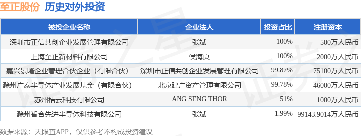 证券之星消息,根据天眼查APP显示,至正股份(603991.SH)新增一起对外投资事件,被投资公司为滁州广泰半导体产业发展基金(有限合伙),法定代表人北京建广资产管理有限公司,投资占比为99.78%。该公司从事商务服务业,注册资本为46000万人民币。目前,至正股份共存在对外投资6项,详见下表: