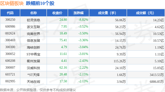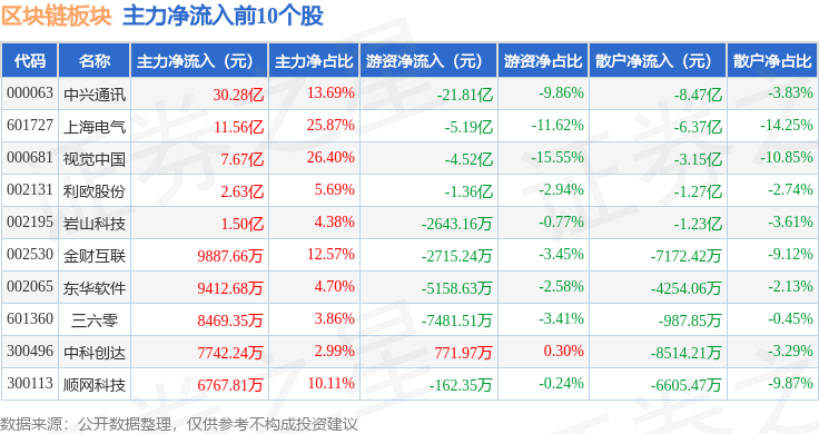 从资金流向上来看,当日区块链板块主力资金净流入16.51亿元,游资资金净流出25.31亿元,散户资金净流入8.8亿元。区块链板块个股资金流向见下表: