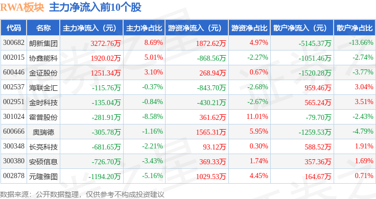 从资金流向上来看,当日RWA板块主力资金净流出2.47亿元,游资资金净流入6082.6万元,散户资金净流入1.87亿元。RWA板块个股资金流向见下表: