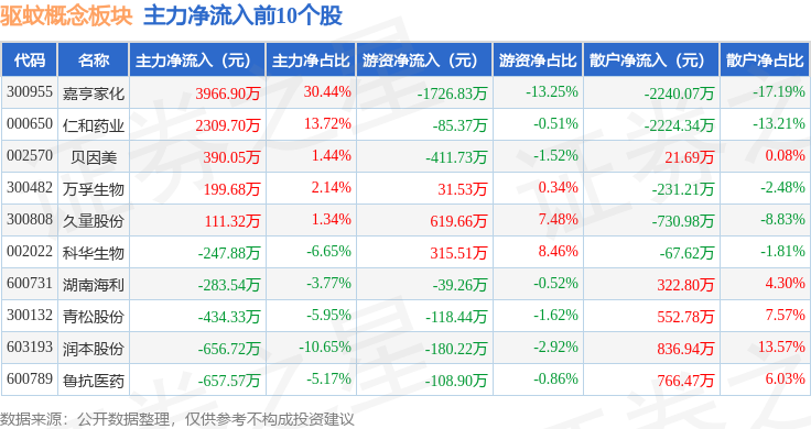 从资金流向上来看,当日驱蚊概念板块主力资金净流出8260.19万元,游资资金净流入1204.35万元,散户资金净流入7055.84万元。驱蚊概念板块个股资金流向见下表: