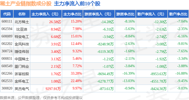 资金流向方面,稀土产业链(989013)指数成份股当日主力资金净流入合计26.78亿元,游资资金净流出合计11.15亿元,散户资金净流出合计15.64亿元。成份股资金流向详情见下表: