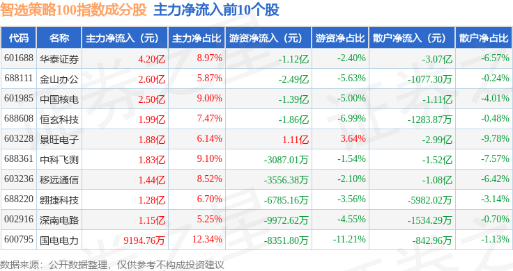 资金流向方面,智选策略100(989015)指数成份股当日主力资金净流出合计40.14亿元,游资资金净流入合计14.29亿元,散户资金净流入合计25.85亿元。成份股资金流向详情见下表: