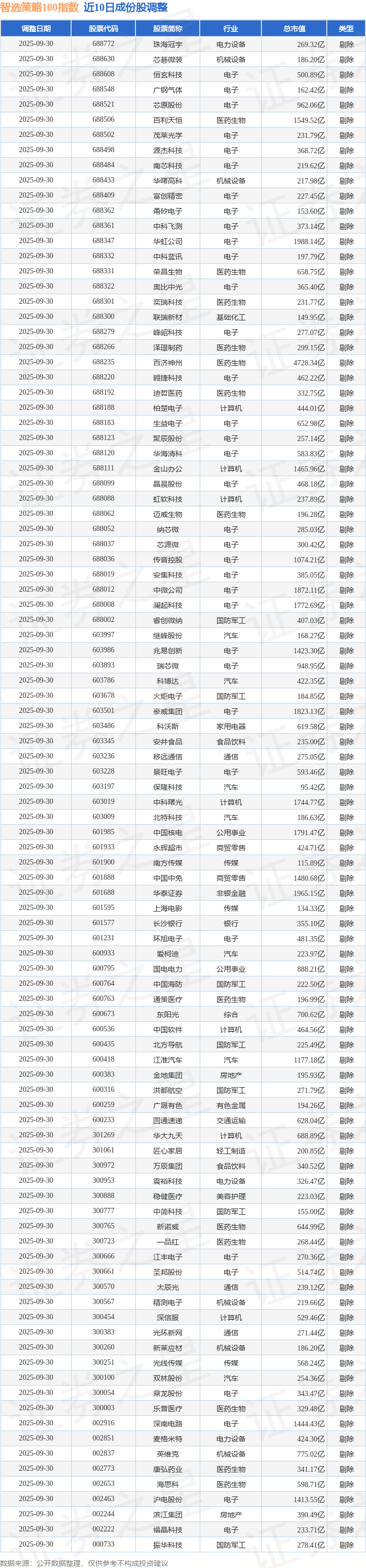 近10日内智选策略100(989015)指数成份股做了调整,剔除了100只股票。