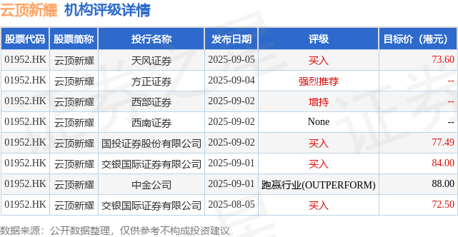 投行对该股的评级以买入为主,近90天内共有4家投行给出买入评级,近90天的目标均价为79.12港元。天风证券最新一份研报给予云顶新耀买入评级,目标价73.6港元。
