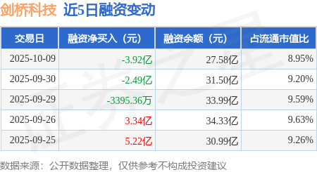 证券之星消息,10月9日,剑桥科技(603083)融资买入6.58亿元,融资偿还10.5亿元,融资净卖出3.92亿元,融资余额27.58亿元,近20个交易日中有12个交易日出现融资净买入。