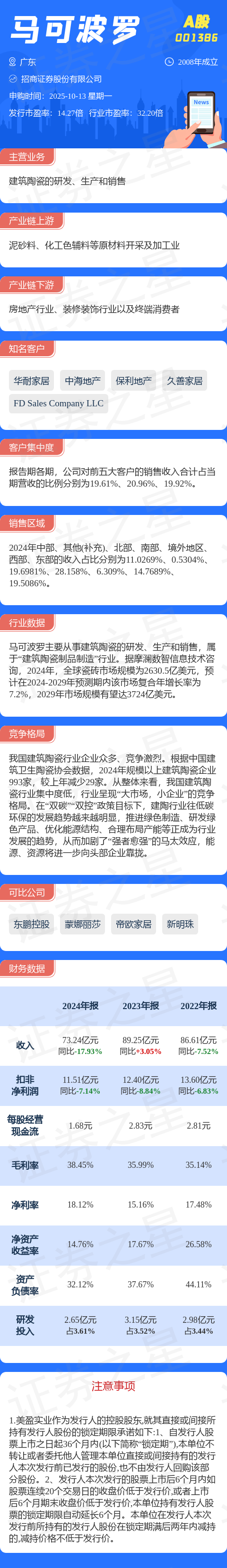 证券之星消息,马可波罗10月13日网上申购,申购代码为001386,中签号公布日期为10月15日。该股概况请见下图: