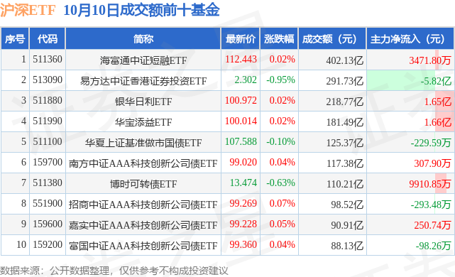 当日沪深ETF成交额前10大ETF基金中7只ETF基金收涨,平均涨幅0.04%,其中短融ETF(511360)以成交额402.13亿元排第一。从主力资金流入看,成交额前10大ETF基金中有6只ETF基金呈现主力资金净流入。