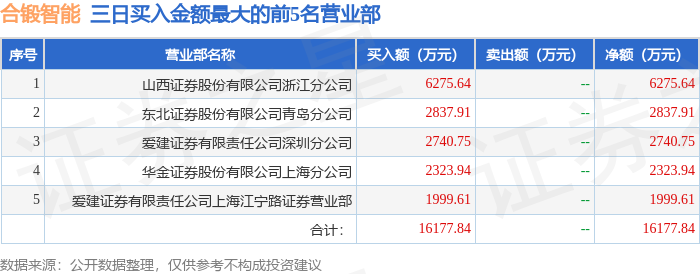证券之星消息,沪深交易所2025年10月10日公布的交易公开信息显示,合锻智能(603011)因非ST、*ST和S证券连续三个交易日内收盘价格涨幅偏离值累计达到20%的证券登上龙虎榜。此次是近5个交易日内第3次上榜。