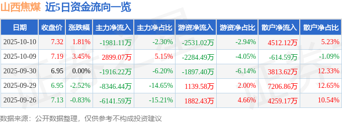 证券之星消息,截至2025年10月10日收盘,山西焦煤(000983)报收于7.32元,上涨1.81%,换手率2.53%,成交量117.38万手,成交额8.62亿元。