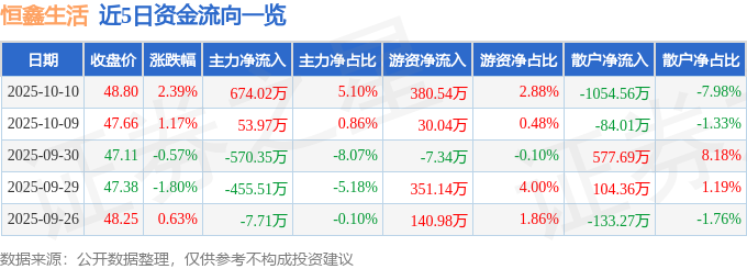 10月10日的资金流向数据方面,主力资金净流入674.02万元,占总成交额5.1%,游资资金净流入380.54万元,占总成交额2.88%,散户资金净流出1054.56万元,占总成交额7.98%。