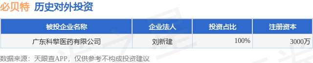 证券之星消息,根据天眼查APP显示,必贝特(688759.SH)新增一起对外投资事件,被投资公司为广东科擎医药有限公司,法定代表人刘新建,投资占比为100%。该公司从事医药制造业,注册资本为3000万。目前,必贝特共存在对外投资1项,详见下表: