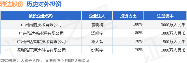证券之星消息,根据天眼查APP显示,雅达股份(920556.BJ)新增一起对外投资事件,被投资公司为广州高谱技术有限公司,法定代表人袁晓楠,投资占比为100%。该公司从事专业技术服务业,注册资本为3000万人民币。目前,雅达股份共存在对外投资4项,详见下表: