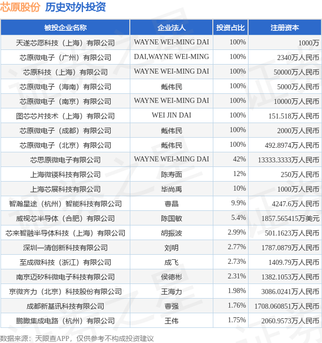 证券之星消息,根据天眼查APP显示,芯原股份(688521.SH)新增一起对外投资事件,被投资公司为天遂芯愿科技(上海)有限公司,法定代表人WAYNE WEI-MING DAI,投资占比为100%。该公司从事软件和信息技术服务业,注册资本为1000万。目前,芯原股份共存在对外投资22项,投资占比前20的项目见下表: