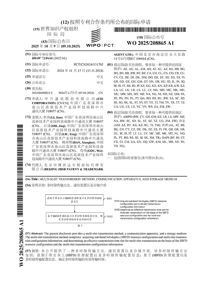 证券之星消息,根据企查查数据显示中兴通讯(000063)公布了一项国际专利申请,专利名为“多时隙传输方法、通信装置以及存储介质”,专利申请号为PCT/CN2024/131702,国际公布日为2025年10月9日。