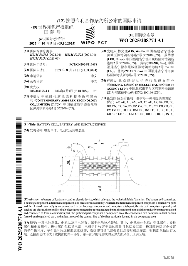 证券之星消息,根据企查查数据显示宁德时代(300750)公布了一项国际专利申请,专利名为“电池单体、电池以及用电装置”,专利申请号为PCT/CN2024/113688,国际公布日为2025年10月9日。