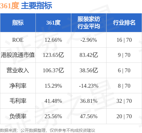 361度港股市值123.65亿港元,在服装家纺行业中排名第9。主要指标见下表: