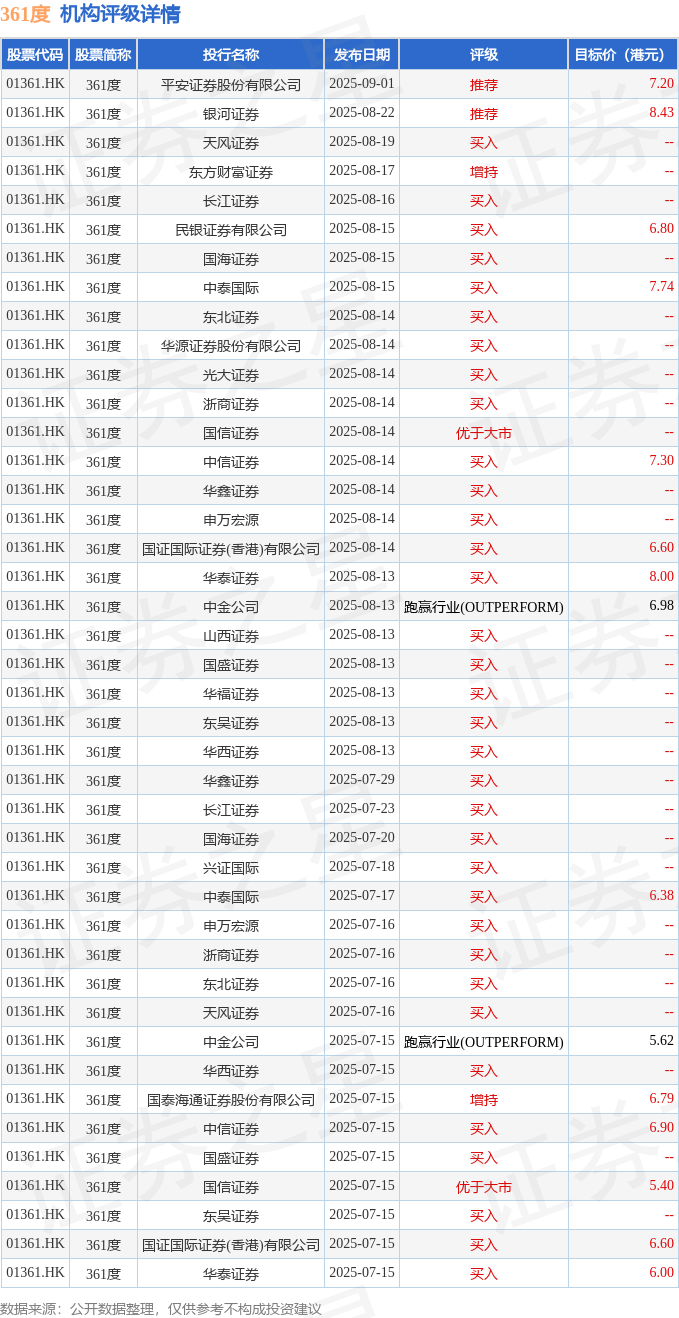 投行对该股的评级以买入为主,近90天内共有34家投行给出买入评级,近90天的目标均价为6.85港元。平安证券股份有限公司最新一份研报给予361度推荐评级,目标价7.2港元。