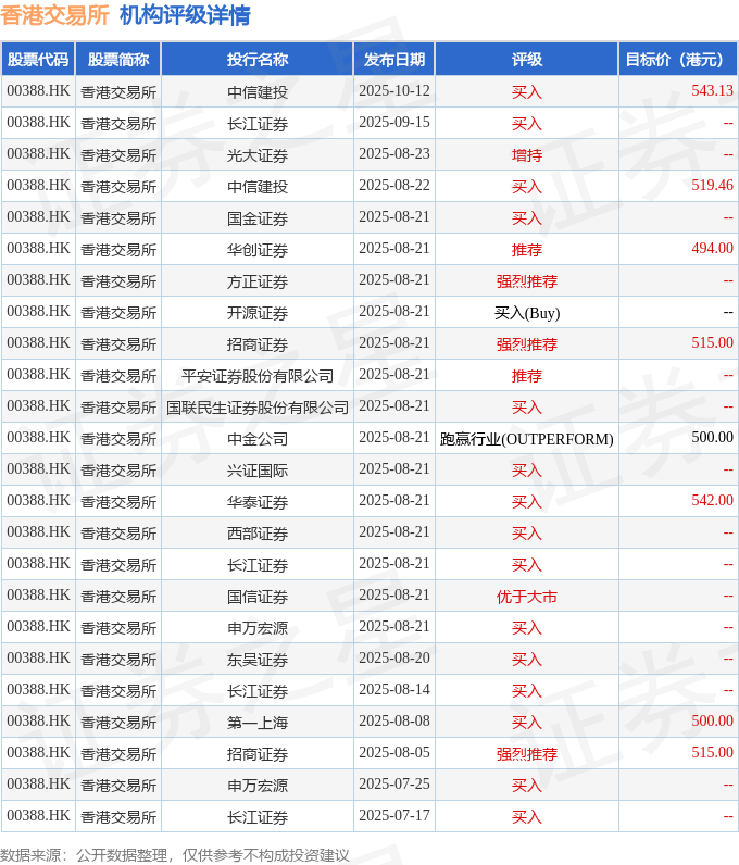 投行对该股的评级以买入为主,近90天内共有15家投行给出买入评级,近90天的目标均价为516.07港元。中信建投最新一份研报给予香港交易所买入评级,目标价543.13港元。
