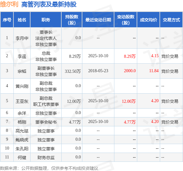 维尔利近半年内的董监高及核心技术人员增减持详情如下:
