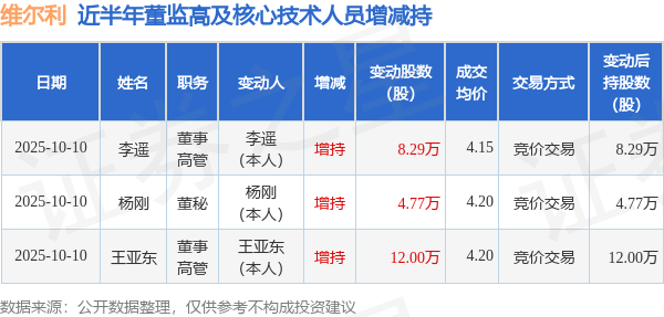 证券之星消息,根据10月13日市场公开信息、上市公司公告及交易所披露数据整理,维尔利(300190)最新董监高及相关人员股份变动情况:2025年10月10日公司董事,高管李遥、董事,高管王亚东、董秘杨刚共增持公司股份25.06万股,占公司总股本为0.0309%。变动期间公司股价上涨4.95%,10月10日当日收盘报4.24元。