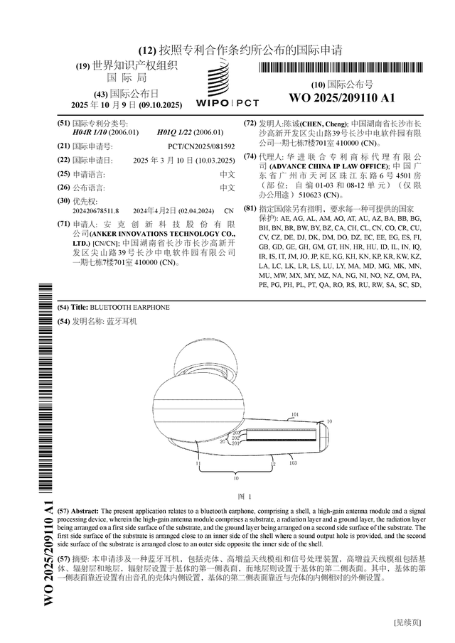 证券之星消息,根据企查查数据显示安克创新(300866)公布了一项国际专利申请,专利名为“蓝牙耳机”,专利申请号为PCT/CN2025/081592,国际公布日为2025年10月9日。