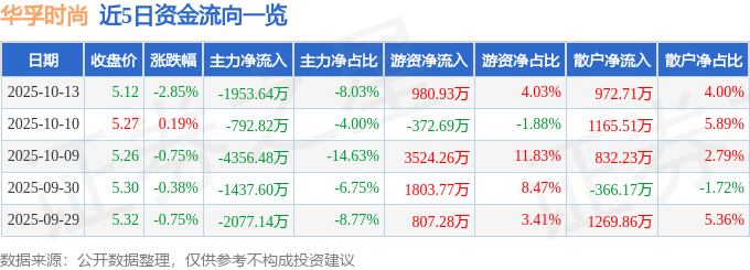 证券之星消息,截至2025年10月13日收盘,华孚时尚(002042)报收于5.12元,下跌2.85%,换手率2.81%,成交量47.8万手,成交额2.43亿元。