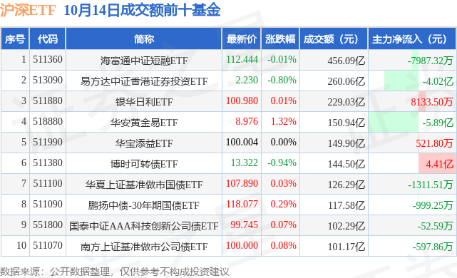 当日沪深ETF成交额前10大ETF基金中6只ETF基金收涨,平均涨幅0.3%,其中短融ETF(511360)以成交额456.09亿元排第一。从主力资金流入看,成交额前10大ETF基金中有3只ETF基金呈现主力资金净流入。