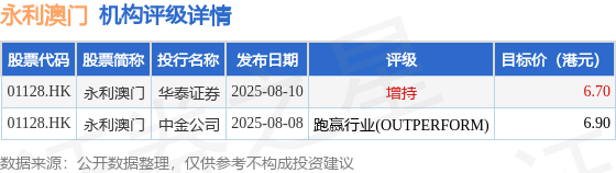 投行对该股的评级以跑赢行业(OUTPERFORM)为主,近90天内共有1家投行给出跑赢行业(OUTPERFORM)评级,近90天的目标均价为6.8港元。华泰证券最新一份研报给予永利澳门增持评级,目标价6.7港元。