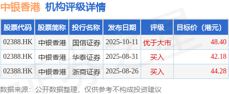 投行对该股的评级以买入为主,近90天内共有2家投行给出买入评级,近90天的目标均价为44.95港元。国信证券最新一份研报给予中银香港优于大市评级,目标价48.4港元。