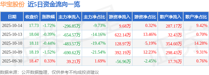 证券之星消息,截至2025年10月14日收盘,华宝股份(300741)报收于17.73元,下跌1.72%,换手率0.28%,成交量1.71万手,成交额3050.05万元。