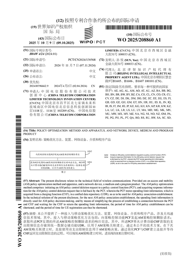 证券之星消息,根据企查查数据显示中国电信(601728)公布了一项国际专利申请,专利名为“策略优化方法、装置、网络设备、介质和程序产品”,专利申请号为PCT/CN2024/130568,国际公布日为2025年10月9日。