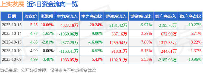 证券之星消息,上实发展10月15日涨停收盘,收盘价5.25元。该股于9点30分涨停,3次打开涨停,截止收盘封单资金为1987.87万元,占其流通市值0.21%。