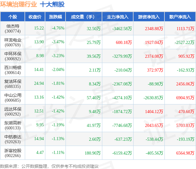 个股表现方面,环境治理行业当日领跌股为倍杰特(300774),该股当日报收15.22,下跌4.76%,成交量32.5万,主力资金净流出3462.58万元。祥龙电业(600769)以下跌3.47%紧随其后,该股当日成交量25.79万,主力资金净流入600.18万元。除此之外,中环环保(300692)、百川畅银(300614)、复洁环保(688335)均进入当日熊股之列。具体个股列表见下表: