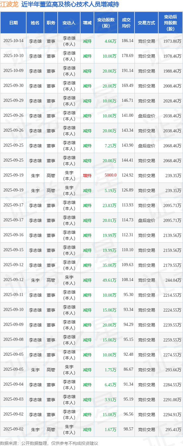 江波龙近半年内的董监高及核心技术人员增减持详情如下: