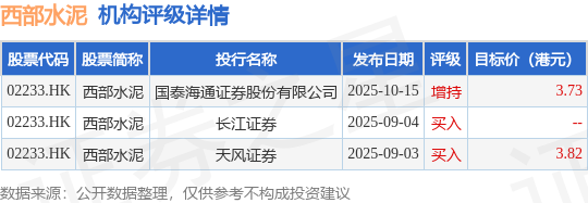 投行对该股的评级以买入为主,近90天内共有2家投行给出买入评级,近90天的目标均价为3.78港元。国泰海通证券股份有限公司最新一份研报给予西部水泥增持评级,目标价3.73港元。