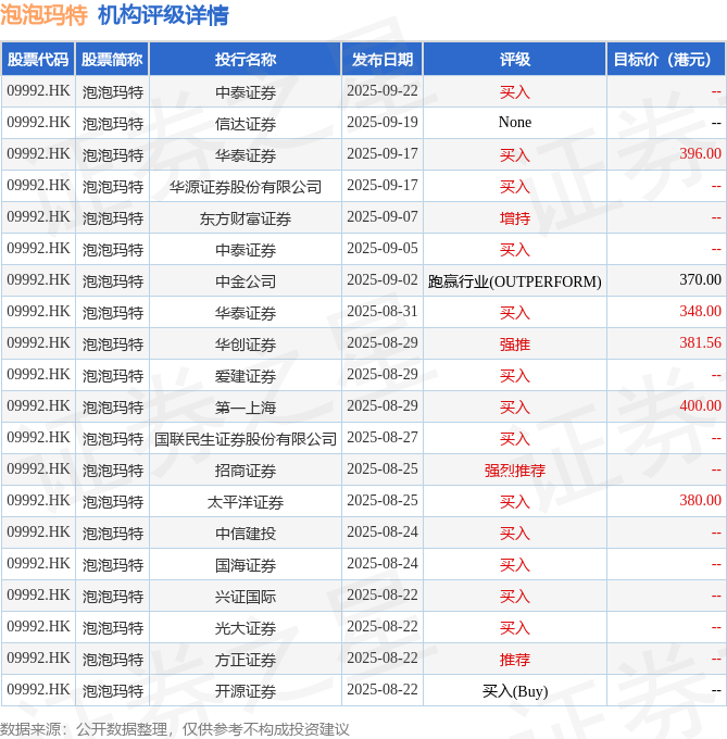 投行对该股的评级以买入为主,近90天内共有30家投行给出买入评级,近90天的目标均价为366.45港元。中泰证券最新一份研报给予泡泡玛特买入评级。