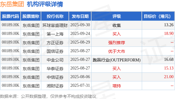 投行对该股的评级以买入为主,近90天内共有3家投行给出买入评级,近90天的目标均价为16.99港元。环球富盛理财最新一份研报给予东岳集团收集评级,目标价13.26港元。