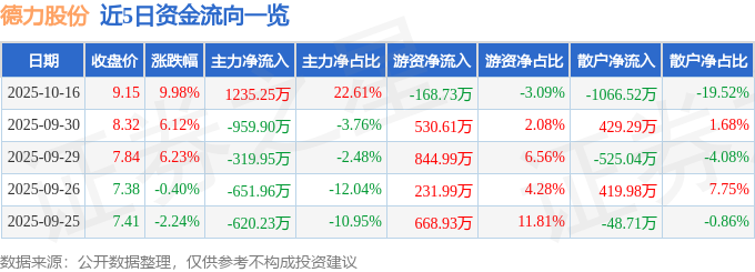 证券之星消息,德力股份10月16日涨停收盘,收盘价9.15元。该股于9点25分涨停,未打开涨停,截止收盘封单资金为3975.22万元,占其流通市值1.46%。