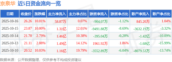 证券之星消息,京泉华10月16日涨停收盘,收盘价26.26元。该股于9点25分涨停,3次打开涨停,截止收盘封单资金为1.05亿元,占其流通市值1.73%。