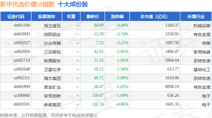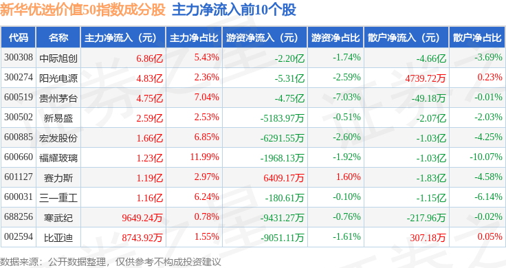 资金流向方面,新华优选价值50(989004)指数成份股当日主力资金净流出合计33.75亿元,游资资金净流入合计5.27亿元,散户资金净流入合计28.48亿元。成份股资金流向详情见下表: