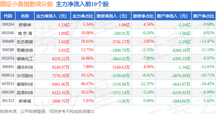 资金流向方面,国证小盘(980202)指数成份股当日主力资金净流出合计39.85亿元,游资资金净流入合计23.49亿元,散户资金净流入合计16.36亿元。成份股资金流向详情见下表: